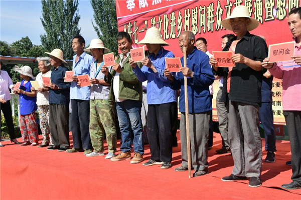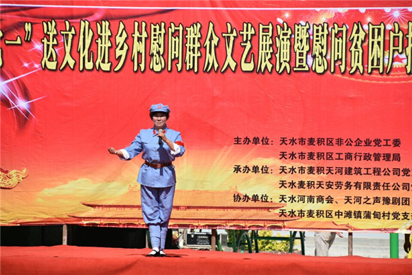在活动现场,麦积区非公企业党工委、天河建筑公司等单位有关领导,向蒲甸村的10户困难群众,每户送去慰问金500元及米、面、油等慰问品各1份。随后,麦积区天河之声艺术团和乐天艺术团的二十几位演员,表演了豫剧、秦腔、歌曲、舞蹈等节目,蒲甸及周边村庄的500多群众观看了演出。