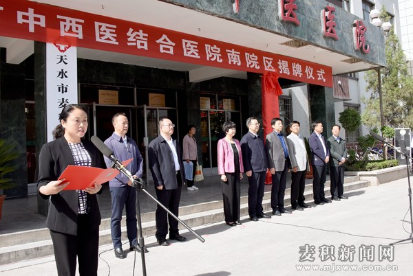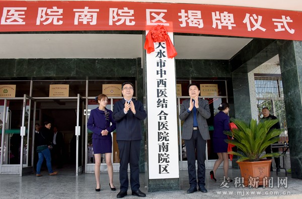 5月2日上午,天水市中西医结合医院南院区举行揭牌仪式。市政协副主席、区委书记张智明和市卫生计生委党委书记、主任杜维成出席仪式并为天水市中西医结合医院南院区揭牌。